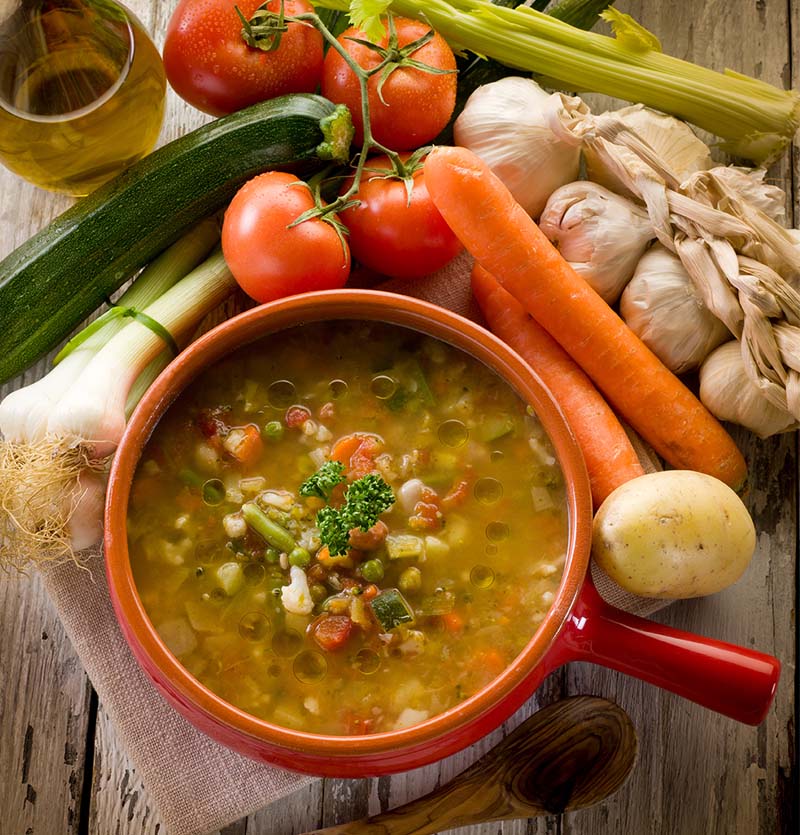 Das Kräuteröl Mediterraneo bringt den letzten Schliff und verleiht der Minestrone eine besonders aromatische Tiefe. Wenn die Suppe noch frischer sein soll, können am Ende auch ein paar zusätzliche Blätter Basilikum verteilt werden.